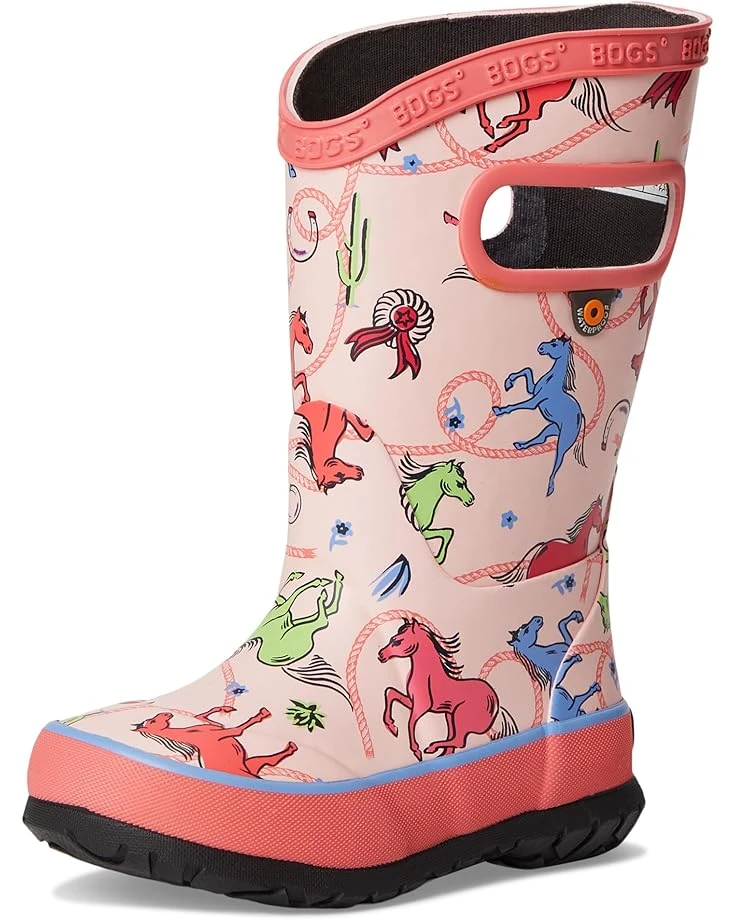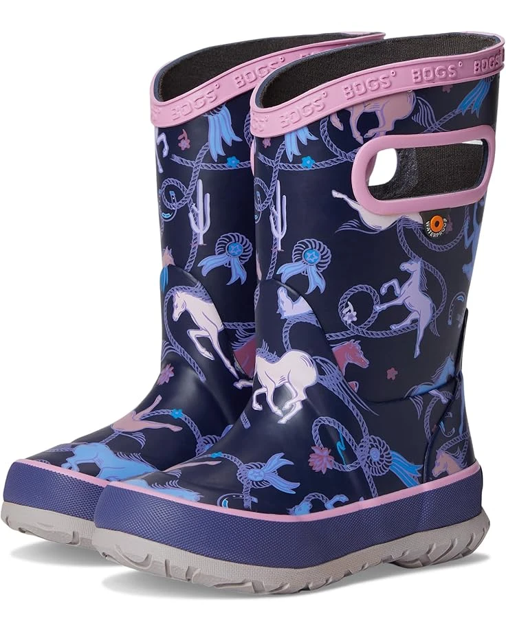 - Let your little ones saddle up for any adventure donning the Bogs® Kids Rainboot Rodeo Horses! Designed with a waterproof rubber upper, these boots keep feet dry through puddles and downpours. The ultra-soft, flexible construction ensures lightweight comfort, while the BOGS Max-Wick™ technology evaporates sweat for all-day freshness. Featuring a bio-based PU insole with DuraFresh™ natural bio-technology, these boots fight odors and support eco-friendly strides. The calf-high, pull-on design offers easy wear for kids on the go, and the durable rubber outsole provides secure footing.
