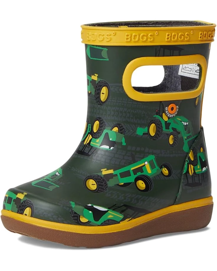 - The Bogs® Kids Skipper II Tractor boots are cleverly named “Skipper”, in case you’re from Maine or California or any place that has boats. Or, if your kids just like to skip. 100% waterproof, these calf-high boots are crafted with ultra-soft and flexible rubber for superior comfort and durability. The fabric lining and bio-based polyurethane footbed provide comfort while minimizing environmental impact. Their DuraFresh natural bio-technology helps fight odors. Featuring BOGS Max-Wick technology that evaporates sweat to keep your kid’s feet dry, these printed boots make a great addition to your kid’s footwear collection.